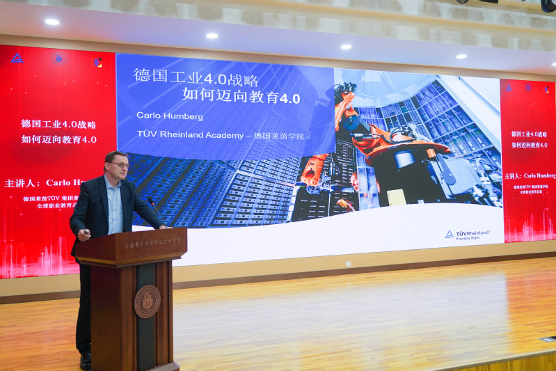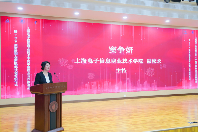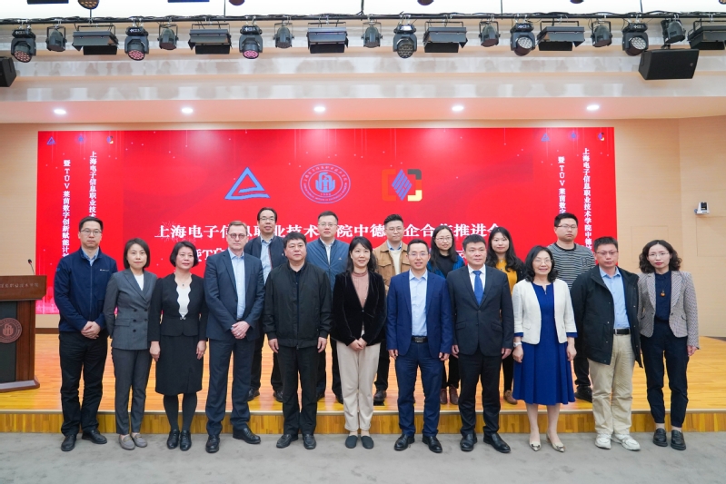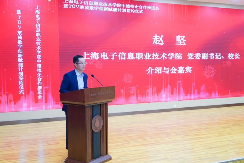4月26日,上海电子信息职业技术学院中德校企合作推进会暨TÜV莱茵数字创新赋能计划签约仪式在C108报告厅举行。上海市教委国际交流处副调研员葛静怡、德国莱茵TÜV集团莱茵学院全球职业教育总监Carlo Humberg、莱茵技术监护(深圳)有限公司总经理陈俊东、中德职业教育产教融合联盟中方理事会常务副秘书长李杏丽、世界技能大赛全国选拔赛技术指导专家、西门子工厂自动化工程有限公司主任工程师王龙华受邀参加,上海电子信息职业技术学院党委书记田钦、副院长窦争妍、中德工程学院党总支书记、院长王向红,企业代表、学校相关职能部门代表、中德工程学院学生等参会。签约仪式由上海电子信息职业技术学院党委副书记、院长赵坚主持。