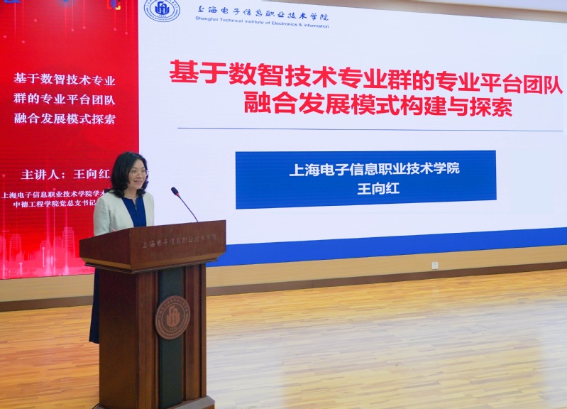 中德工程学院党总支书记、院长王向红教授作了题为《基于数智技术专业群的专业平台团队融合发展模式构建与探索》报告,介绍了数字智造技术专业群的建设背景与使命、定位与目标、重点实施任务以及预期成效,提出数字智造技术专业群“专业—平台—团队”融合发展路线,实现人才、标准、模式、产业四大赋能,发扬数智技术专业群优势,建设优质品牌。