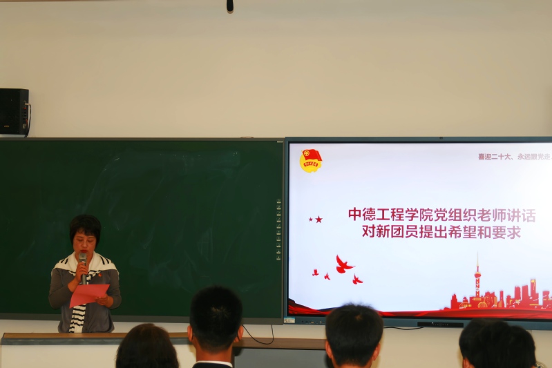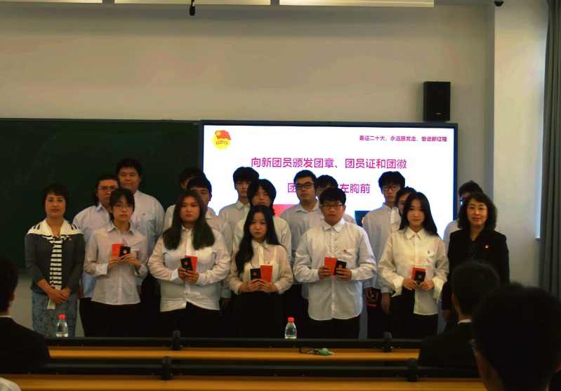 伴随着庄严的国歌响起,入团仪式也缓缓拉开了帷幕,主持人向全体团员和新发展团员介绍举行入团仪式的意义并宣读了新团员名单。经济与管理学院宋慧涛老师及中德工程学院施云美老师给新团员代表佩戴团徽,颁发团员证和团章。