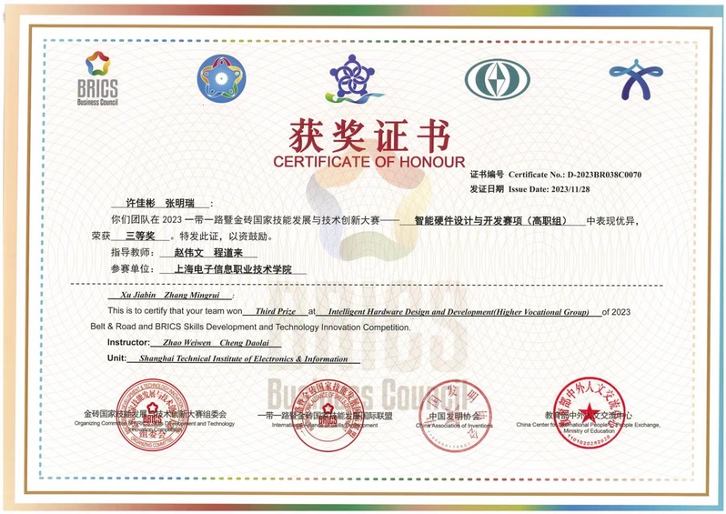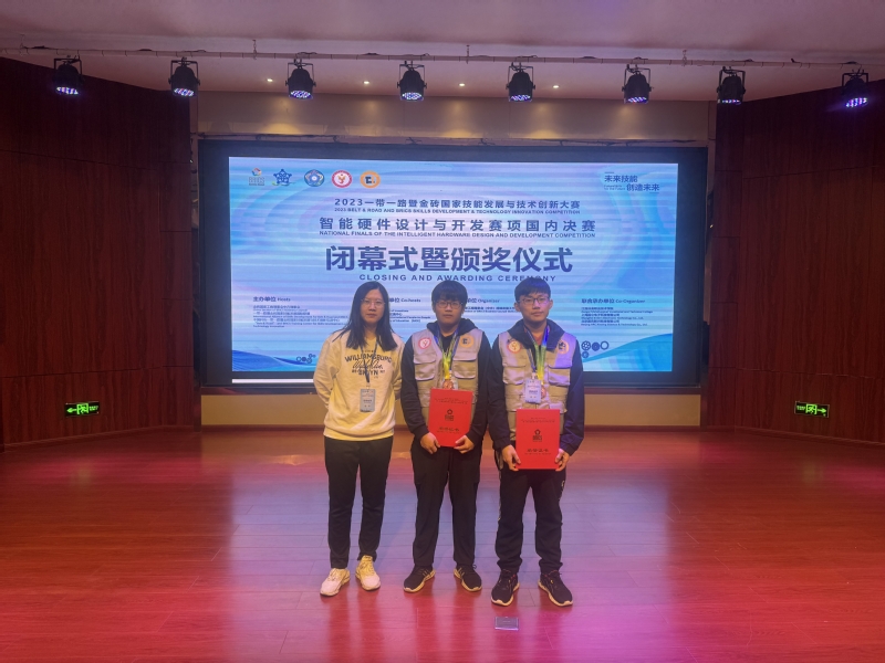 近日,2023一带一路暨金砖国家技能发展与技术创新大赛智能硬件设计与开发赛项国内总决赛在江西冶金职业技术学院举行,13个省(直辖市)、30所院校、62支队伍、124名选手同台竞技。我校三队中德工程学院许佳斌、张明瑞两位同学荣获三等奖,程道来、赵伟文两位指导教师获得优秀指导教师奖。