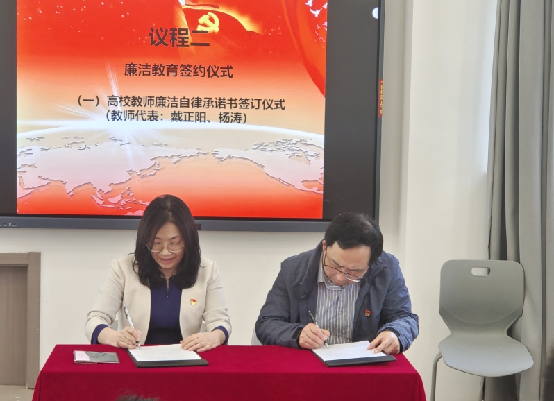 廉洁教育签约仪式上,戴正阳老师、杨涛老师作为教师代表上台签署《高校教师廉洁自律承诺书》。