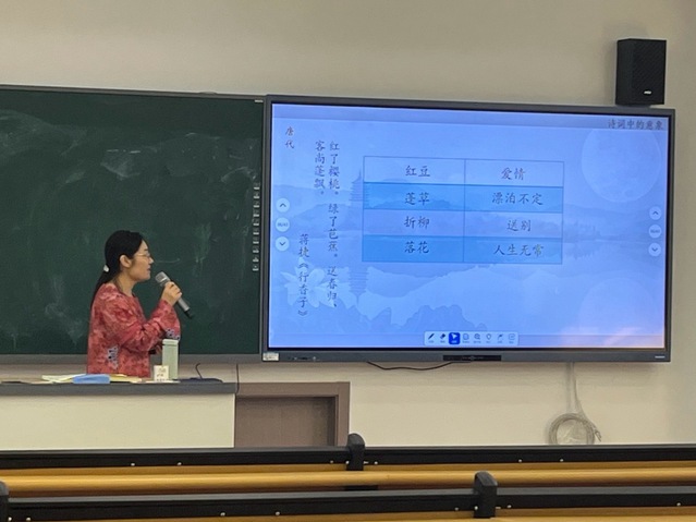 徐莉老师从诗词中的菊花“秋丛绕舍似陶家,遍绕篱边日渐斜”;再讲到牡丹“国色朝酣酒,天色夜染衣”;再到璀璨星河的唐诗宋词。过程中,在诗词填空等互动中,同学们踊跃回答问题。这些作品涵盖了山水风景、情感表达等多个主题,展现了中国诗词的丰富内涵和艺术价值,现场气氛热烈。