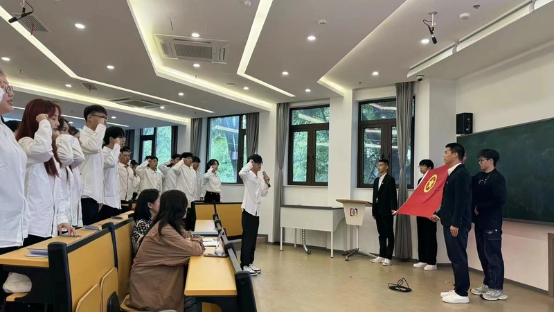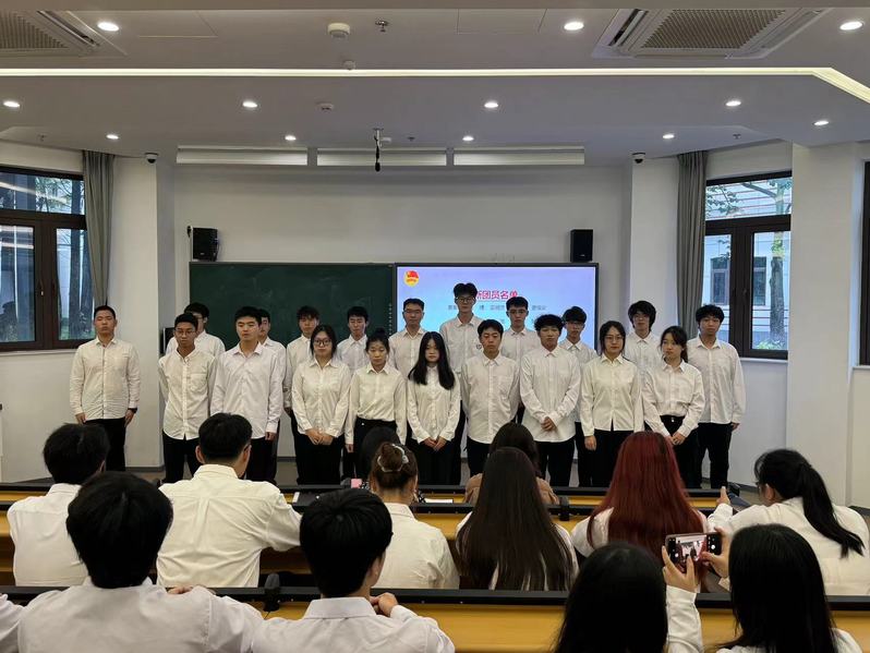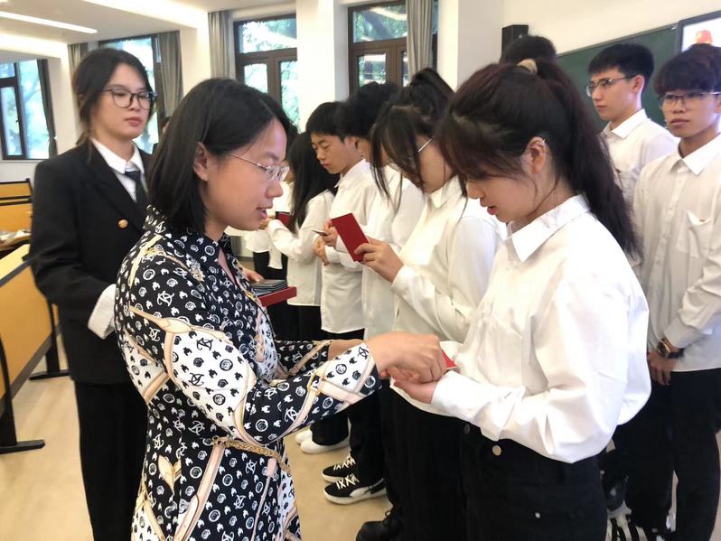 吴莉洁老师和张裕老师为新团员佩戴团徽,颁发团章、团员证。随后,张振威同学带领全体团员进行入团宣誓,新团员们的语气满是坚定、誓言饱含热情。新团员代表崔程焜和优秀团员代表杨延韬在发言中表示在团组织的指导下,将继续努力学习、突破自我,争做有理想、敢担当、能吃苦、肯奋斗的新时代好青年。