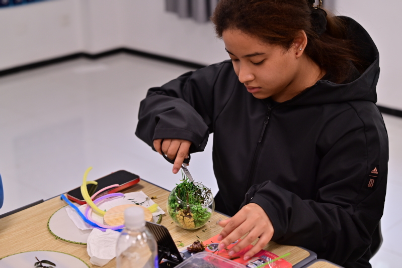 方寸天地间,光影绘永恒。干花艺术体验区化身现代美学实验室,同学们以玻璃为幕、永生花为笔,将满天星、绣球等花材与暖黄灯串巧妙编织。或悬垂成星雨银河,或层叠作立体画卷,当玻璃罩缓缓闭合,刹那芳华定格为永恒,光影交错间诠释着生命艺术的隽永之美。