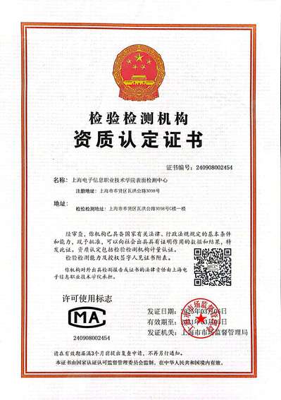 CMA认证是我国检验检测领域的强制性准入制度,代表检测机构具备向社会出具公证性、法律效力数据报告的资质。在首次现场评审中,由上海市质量技术监督局委派的专家组严格核查了中心的管理体系、设备配置、环境条件及技术能力,并通过盲样测试、人员比对、报告溯源等方式对金属材料表面硬度、涂层附着力、拉伸强度、覆盖层厚度、微观形貌分析等11项关键指标进行全维度考核。经评审,中心在人员素质、设备精度、检测方法及质量控制等方面均符合《检验检测机构资质认定评审准则》要求,获准在认证范围内开展检测服务并出具权威报告。