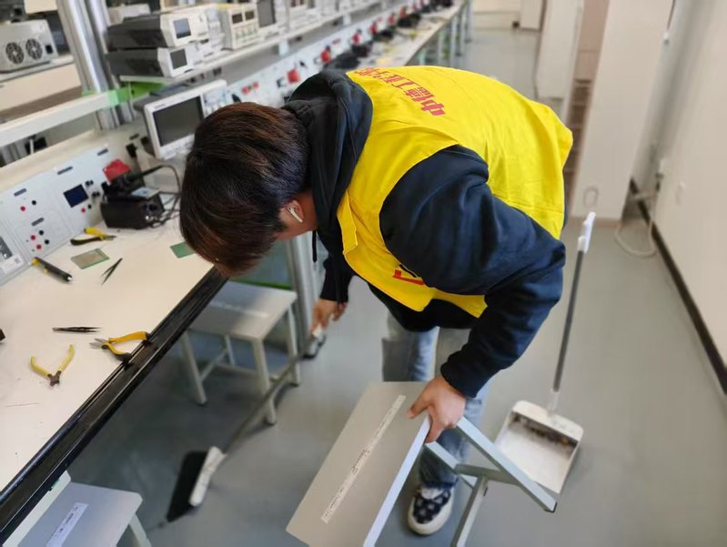 3月13-17日学生会开展‘净’启新程,点亮‘实’光专项行动。对13个专业实训室开展地毯式清洁,实训室里此起彼伏着水桶晃荡声、扫帚摩擦声和这边还有块污渍的提醒,汗水浸透了后背,抹布从白色搓成灰色,最终让蒙尘的设备露出铭牌光泽,散乱的工具排成整齐队列。这场“较真式”大扫除,让劳动回归最朴素的擦洗清扫,用实实在在的汗水换来窗明几净的教学环境,这次劳动教育与职业素养培育同频共振,实现实训环境焕然一新、育人效能提档升级。