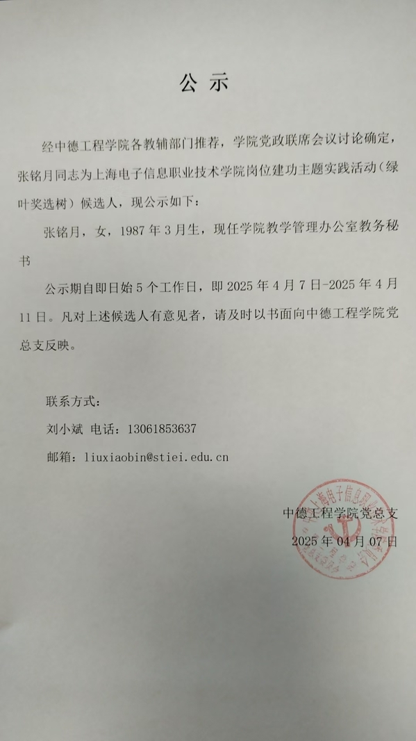 上海电子信息职业技术学院岗位建功 主题实践活动(绿叶奖选树)候选人公示
