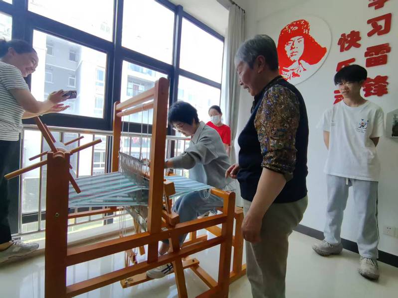 在手工体验环节,师生们跟着陈老师制作“福禄”葫芦艾草包:填充社区自种手工研磨艾绒、缝制吉祥纹饰、搭配环保材料装饰。看到一枚枚绣着“平安健康”的艾草包在手中成型,入党积极分子姜垚同学感慨:“原来传统文化不是橱窗里的展品,而是能握在手里、用在生活中的烟火气。”随后支部书记张晶老师与党总支副书记施云美老师跟随手艺传承人宋阿姨来到传统织布机前,在经纬穿梭间感受传统技艺的魅力,沉浸式感受着“一丝一缕皆匠心”的传统技艺温度。