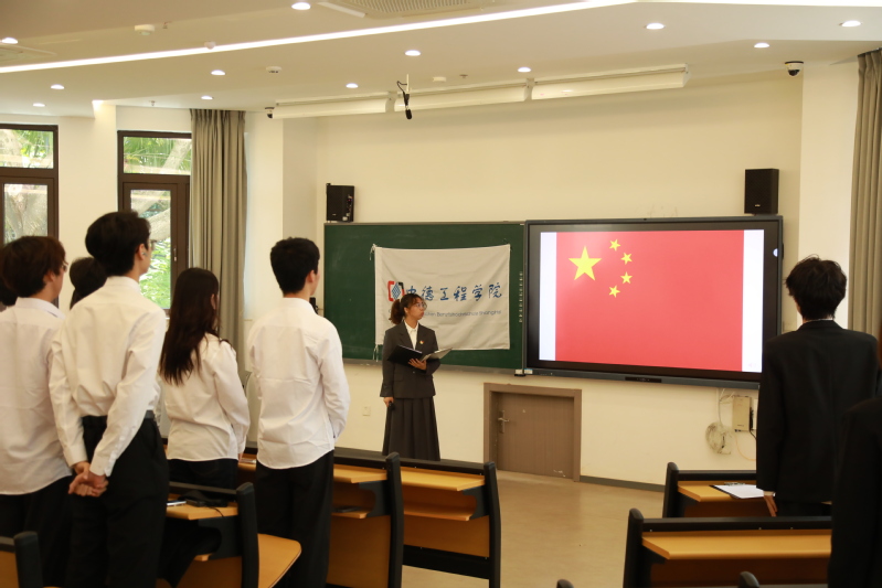 在雄壮的国歌声中,全体师生肃立注目,澎湃的爱国情怀化作新时代青年的精神底色。学院学生党支部书记张晶、团总支书记张裕为新团员佩戴团徽、颁发证书,熠熠生辉的团徽映照着青年们坚毅的面庞,标志着光荣使命的郑重交付。