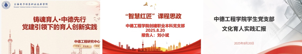 在组织育人模块中,三位党支部书记分别介绍了各支部的“一支部一特色”实施情况。工程研究中心党支部书记罗龙清以“铸魂育人·中德先行 党建引领下的育人创新实践”为题,介绍了支部课程思政与科研育人融合、“三带四融”培养链、工程创新班双螺旋培养计划等实践。创建职业本科党支部书记刘小斌以“智慧红匠”为主线,立足“电工基础”课程将专业知识与思政元素深度融合。学生党支部书记张晶围绕文化育人主题,介绍了行走的思政课堂、校社企协同培育工匠文化、双支部联动班风建设等实践。